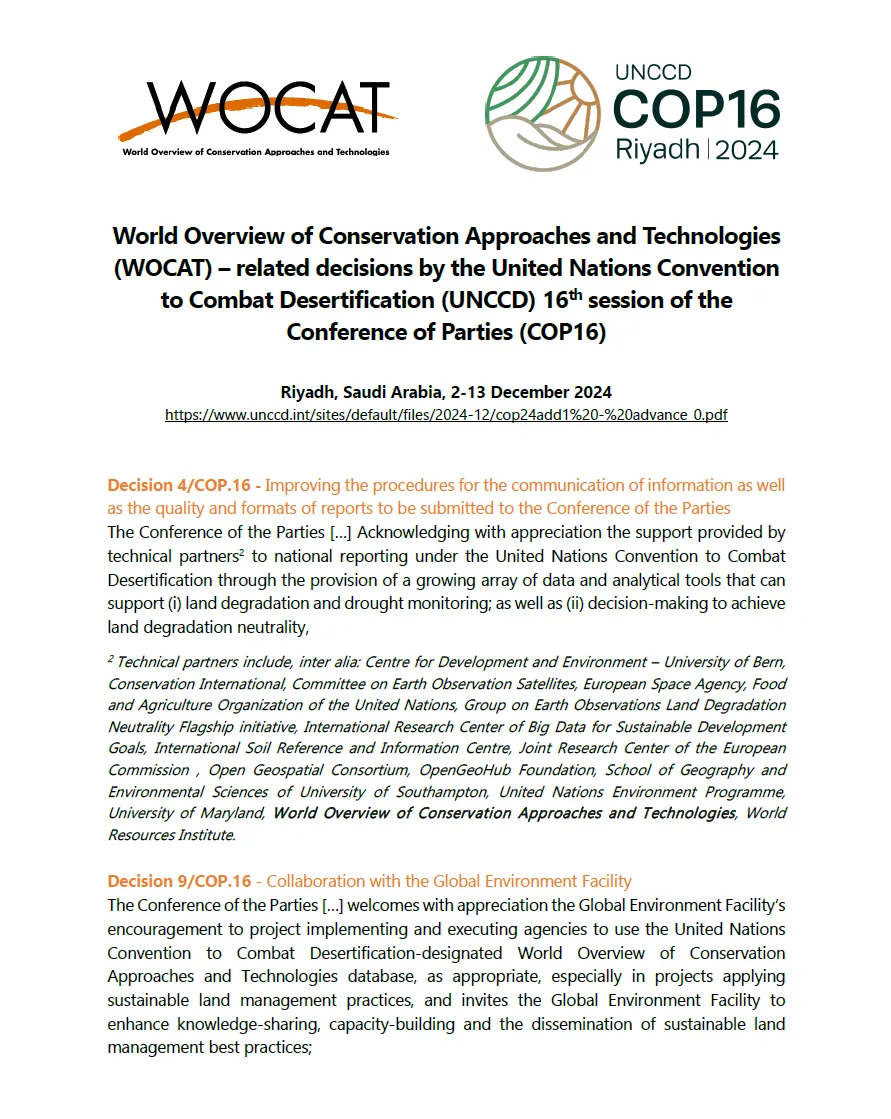 4 of the 37 decisions taken at COP16 highlight the role of WOCAT in supporting knowledge sharing, generating SLM good practices data and building capacity in collaboration with UNCCD and other partners.