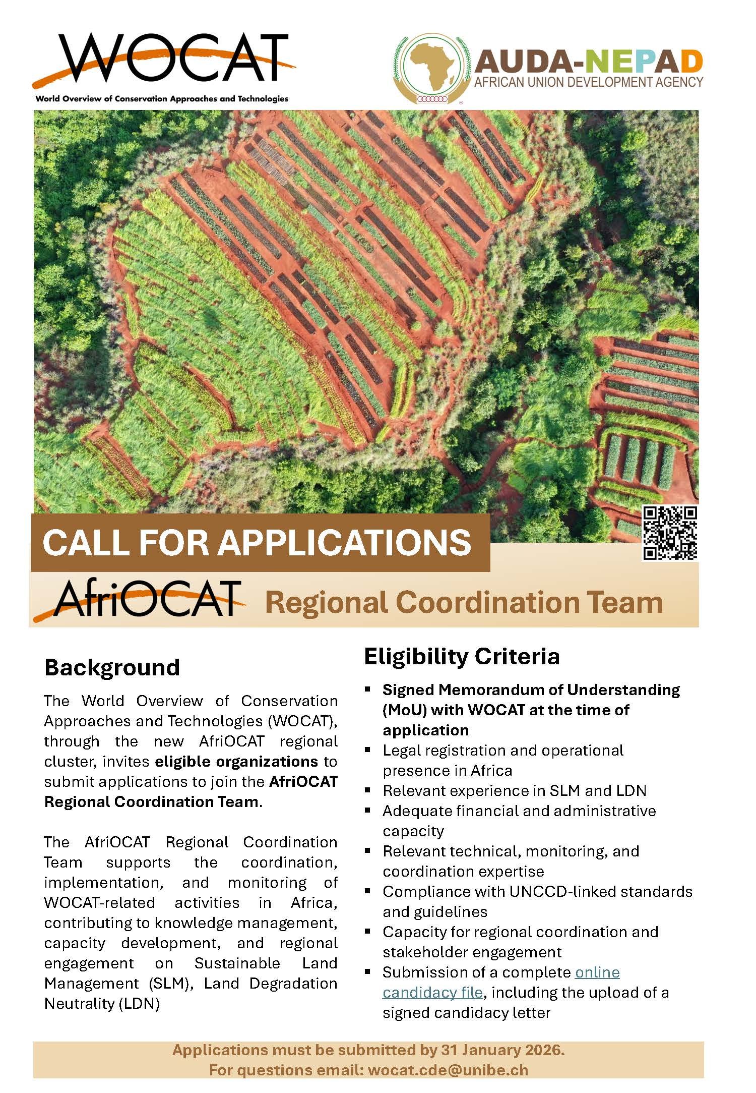 The AfriOCAT Regional Coordination Team supports the coordination and implementation of WOCAT-related activities across Africa, strengthening regional collaboration, knowledge exchange, and capacity development on Sustainable Land Management (SLM) and Land Degradation Neutrality (LDN).