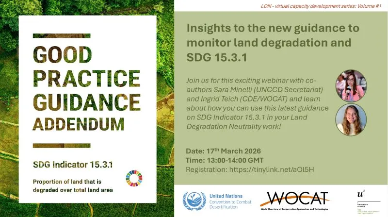 Are you working on LDN or are you involved in SDG Indicator 15.3.1 reporting? Then join our upcoming webinar to learn about the Addendum to the Good Practice Guidance on SDG Indicator 15.3.1. The co-authors Sara Minelli (UNCCD Secretariat) and Ingrid Teich (CDE/WOCAT) will present how to use this new guidance to monitor land degradation and SDG 15.3.1 in your Land Degradation Neutrality work.