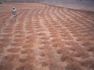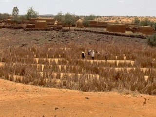 Rehabilitation of degraded land through manured planting pits, in combination with contour stone lines. The planting pits are used for millet and sorghum production on gentle slopes.