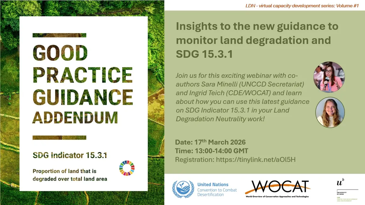 Are you working on LDN or are you involved in SDG Indicator 15.3.1 reporting? Then join our upcoming webinar to learn about the Addendum to the Good Practice Guidance on SDG Indicator 15.3.1. The co-authors Sara Minelli (UNCCD Secretariat) and Ingrid Teich (CDE/WOCAT) will present how to use this new guidance to monitor land degradation and SDG 15.3.1 in your Land Degradation Neutrality work.