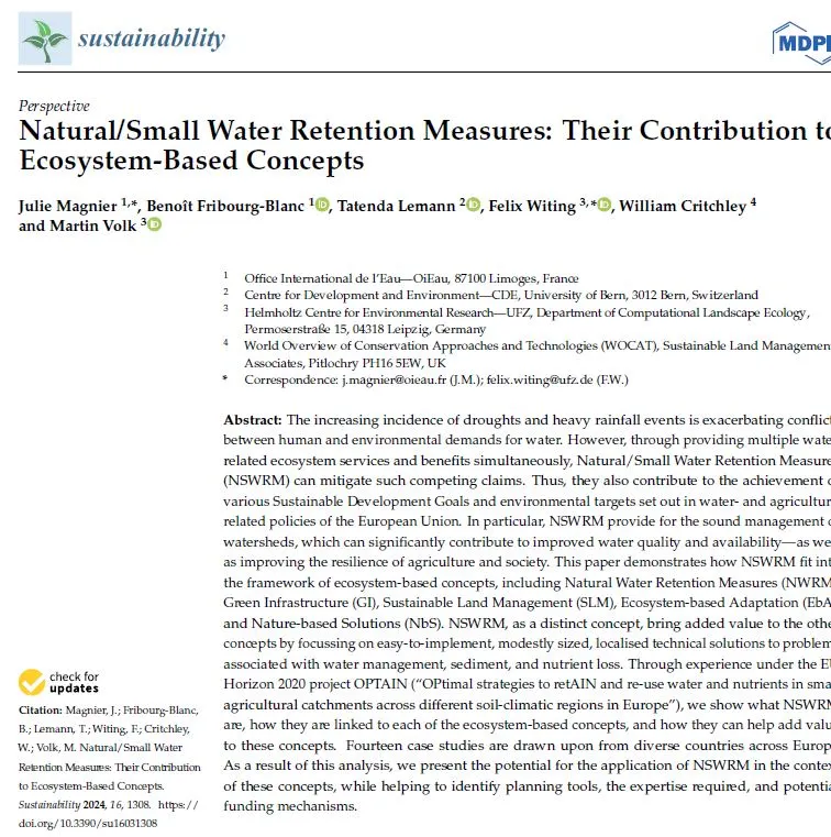 Through experience under the EU Horizon 2020 project OPTAIN, the authors show what NSWRM are, how they are linked to each of the ecosystem-based concepts, and how they can help add value to these concepts. They present the potential for the application of NSWRM in the context of these concepts, while helping to identify planning tools, the expertise required, and potential funding mechanisms. The fourteen case studies as many other NSWRM documented within OPTAIN are available in the WOCAT SLM Database.
