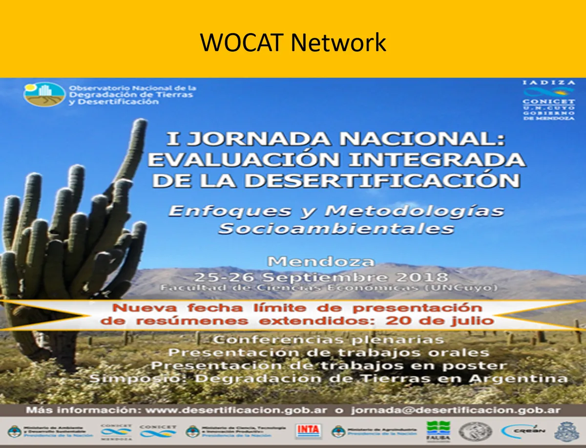 The Observatorio Nacional de la Degradación de Tierras y Desertificación (ONDTyD) and the Instituto Argentino de Investigaciones de las Zonas Áridas (IADIZA-CONICET) organize the first conference on integrated evaluation of desertification: approaches and socio-environmental methodologies, on 25-26 September 2018 in Mendoza, Argentina.