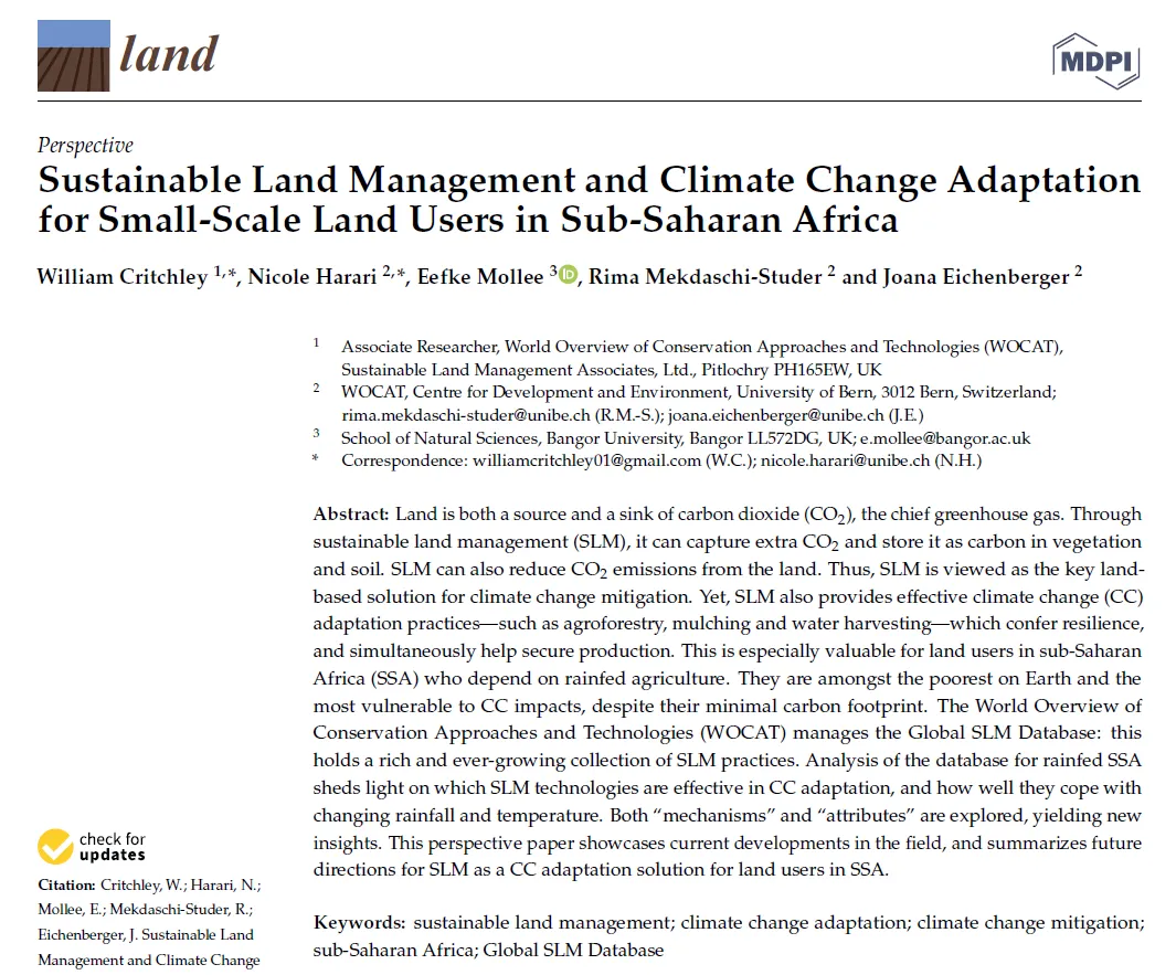 The new perspective paper highlights the importance of SLM in mitigating climate change and supporting adaptation practices, particularly in rainfed regions of sub-Saharan Africa (SSA). It analyses WOCAT Global SLM Database and presents current advancements in the field and outlines future directions for utilizing SLM as a climate change adaptation solution for land users in SSA.