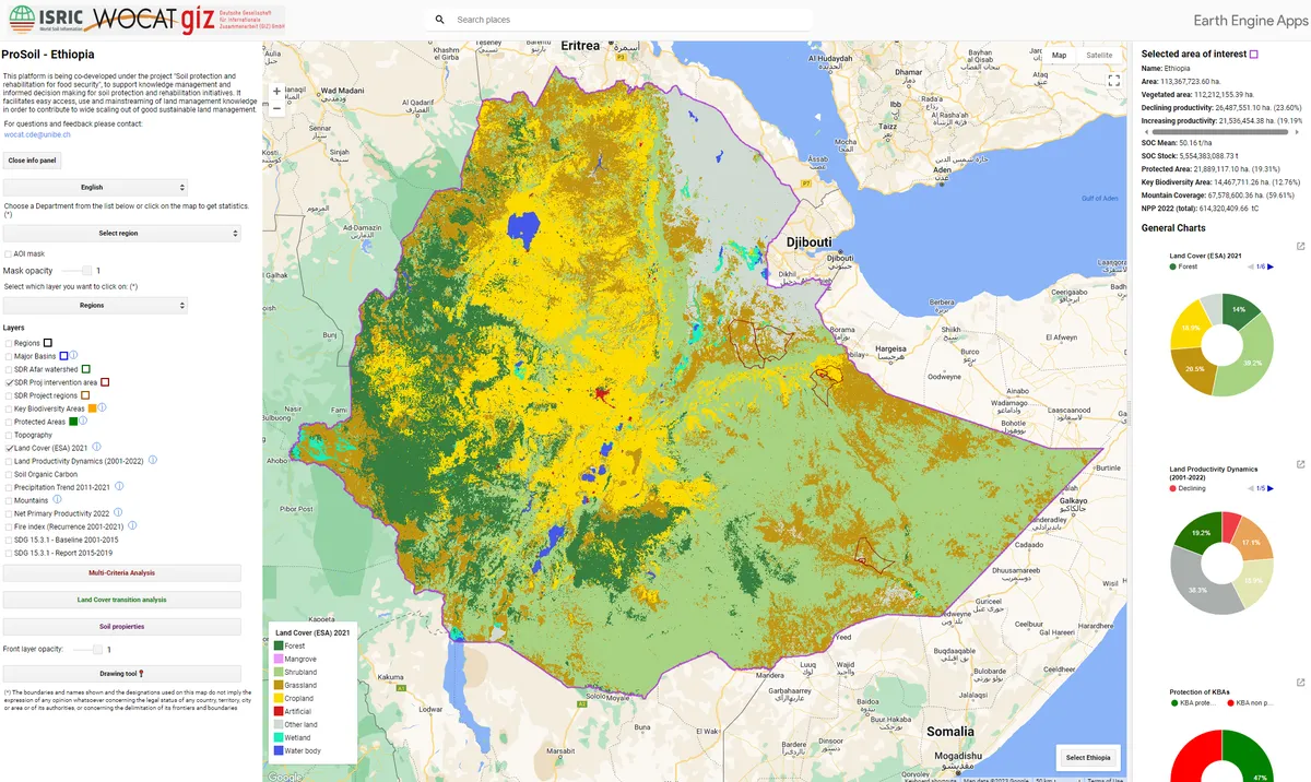 In late July, a WOCAT training took place in Addis Ababa, focusing on EarthEngine in collaboration with the GIZ ProSoil project. Participants representing the Ministry of Agriculture, agricultural bureaus, and the Alliance of Bioversity International and CIAT learned to access satellite image catalogs and analyze time series to implement the principle of Convergence of Evidence to map Land Degradation Neutrality in Ethiopia.