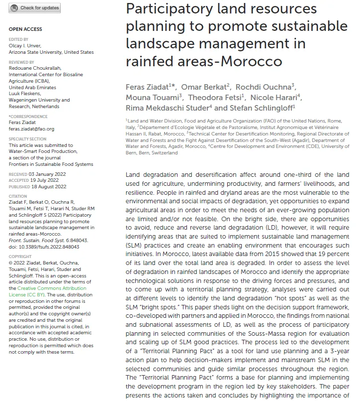 This paper sheds light on the decision support framework, co-developed with partners and applied in Morocco, the findings from national and subnational assessments of land degradation, as well as the process of participatory planning in selected communities of the Souss-Massa region for evaluation and scaling up of SLM good practices. The process led to the development of a “Territorial Planning Pact” as a tool for land use planning and a 3-year action plan to help decision-makers implement and mainstream SLM in the selected communities and guide similar processes throughout the region.