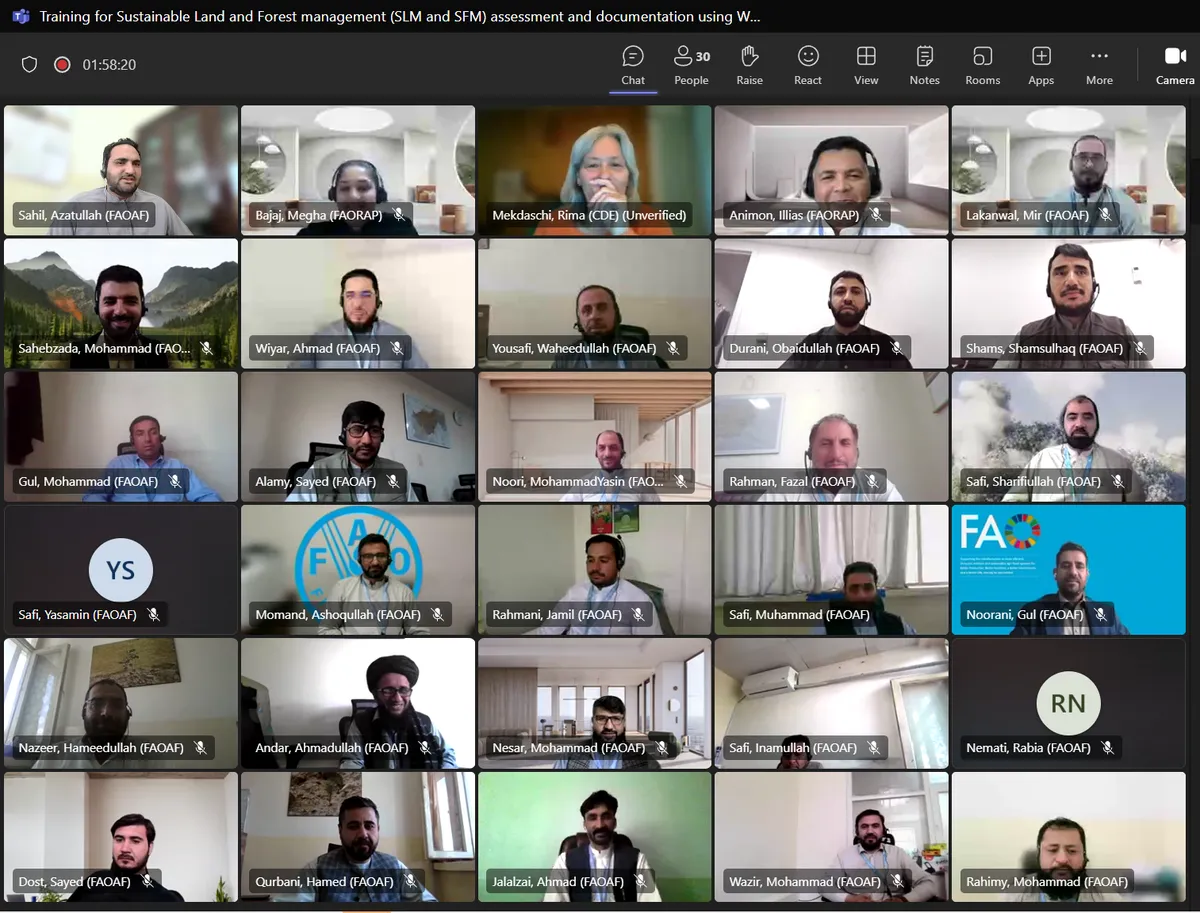 In the framework of the ‘Community-based Sustainable Land and Forest Management in Afghanistan’ implemented since 2018 around 30 participants joined the training on ‘ Sustainable Land and Forest management (SLM and SFM) assessment and documentation using World Overview of Conservation Approaches and Technologies (WOCAT) and Land Degradation Assessment in Drylands (LADA) tools in Afghanistan’. The project aims to promote SLM and SFM practices in Afghanistan for promoting rangeland productivity, biodiversity conservation and climate change mitigation in 5 provinces. The training was held online on 16 and 17 September 2024 and will be followed by field days for hands-on assessment and documentation of SLM good practices to combat land degradation.