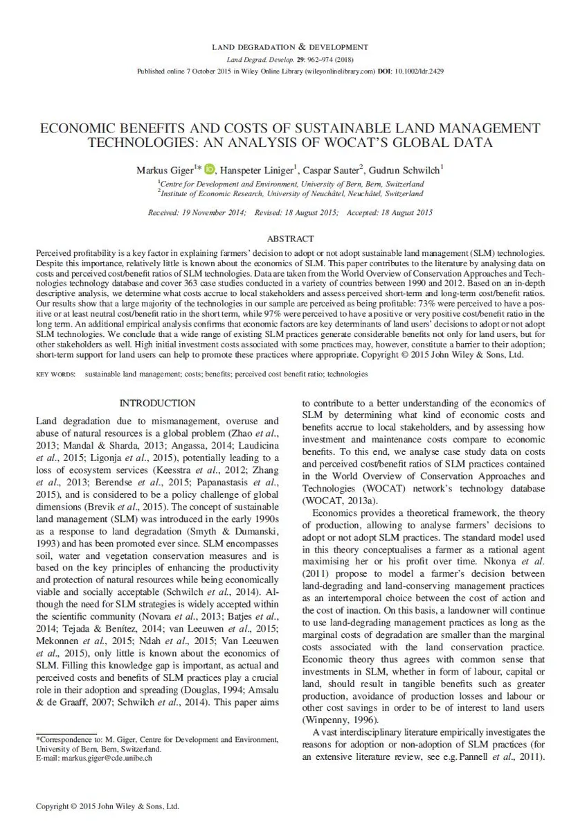 and perceived cost/benefit ratios of SLM Technologies using data of the WOCAT SLM Database. Nevertheless, this information is not consistent in terms