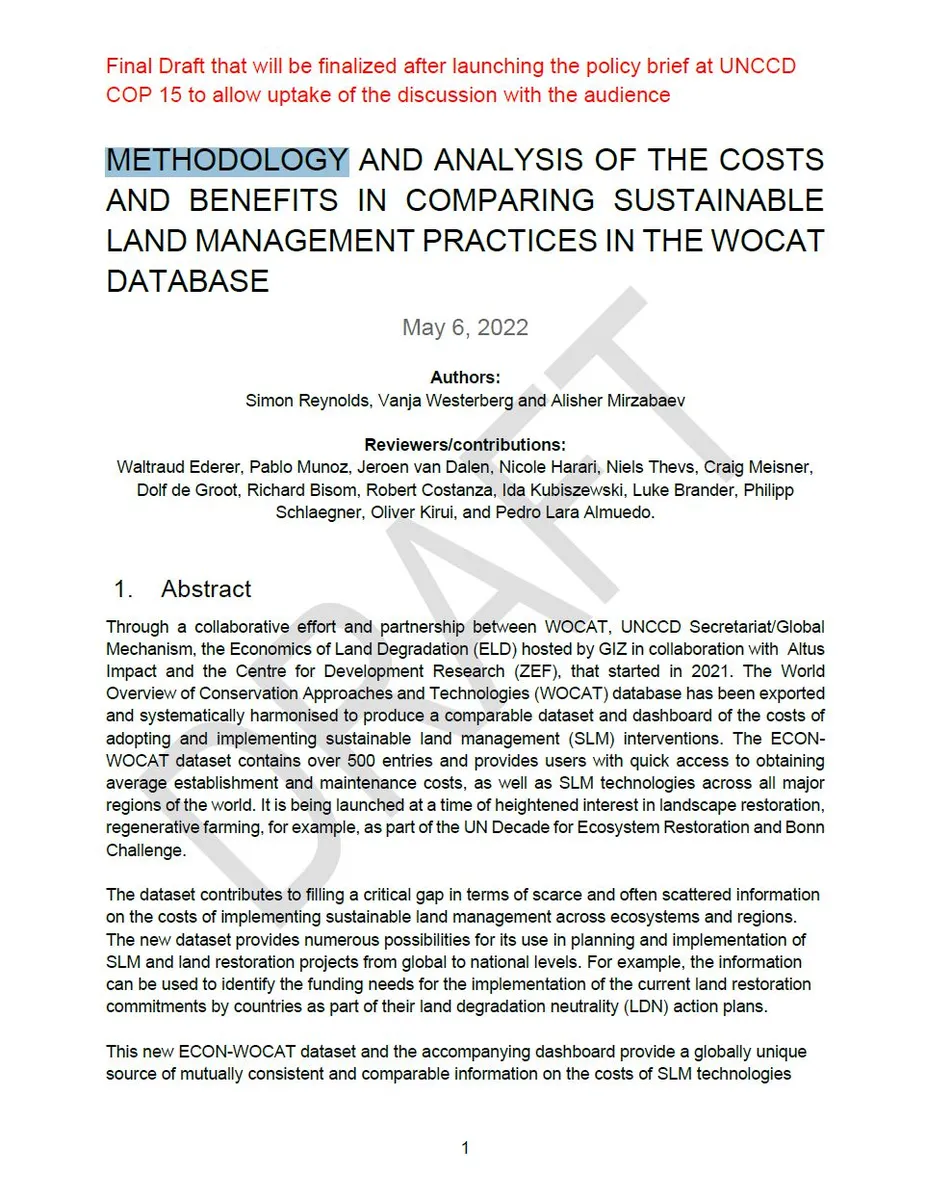 However, there is scarce and often scattered information on the wide range of costs and benefits of ecosystem restoration across biomes, SLM practices, and regions in monetary units. Developing accurate measures of costs and benefits of SLM is useful for assessing the costs and benefits associated to alternative pathways to achieve land degradation neutrality (LDN) by identifying the most cost-effective courses of action. Additionally, it enhances the appraisal of investments associated to the adoption of SLM, including the evaluation of LDN Transformative Projects and Programmes.