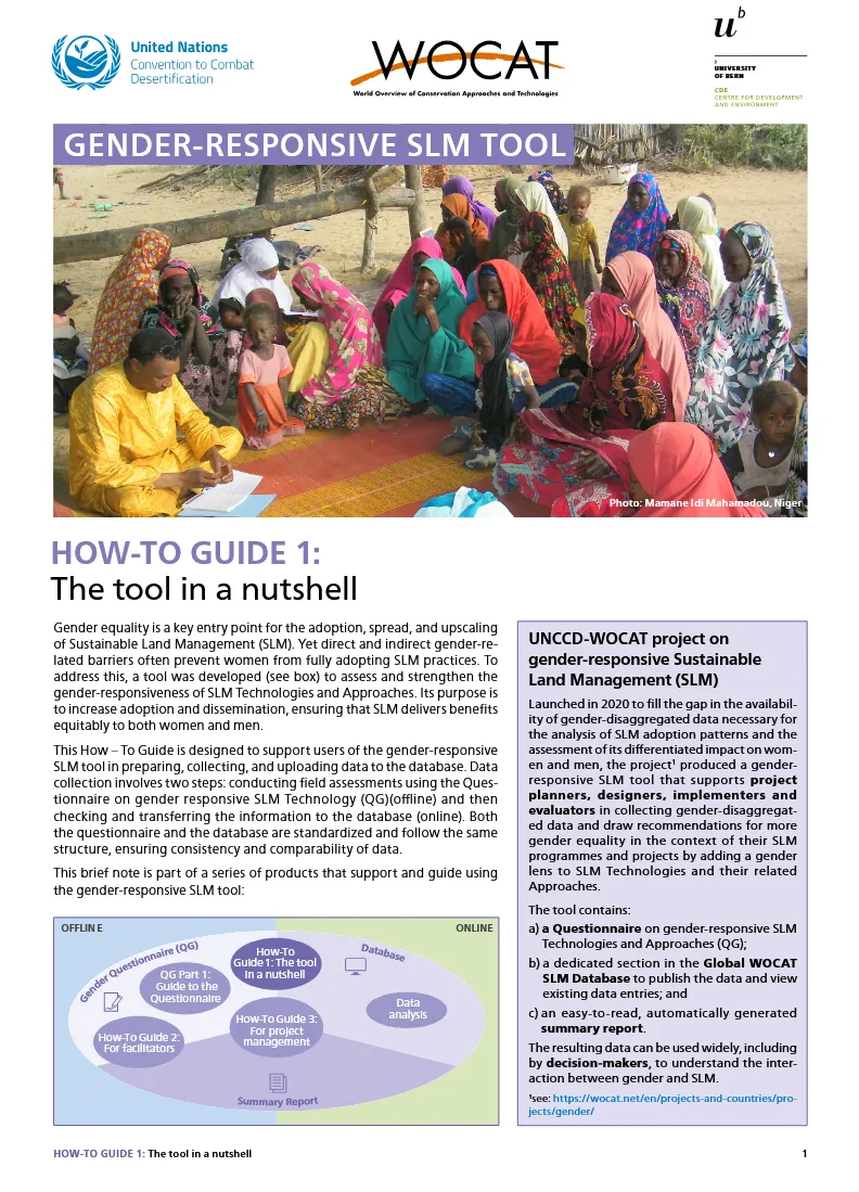 WOCAT and UNCCD designed a tool to assess the gender-responsiveness of SLM Technologies and Approaches and to identify areas of improvement. This tool supports project planners, designers, and implementers in their effort to scale up SLM Technologies and Approaches for women and men equally.
