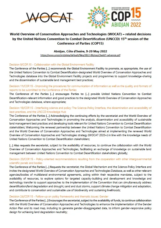 A total of 36 decisions were taken at COP15. Five decisions highlight the role of WOCAT in supporting knowledge sharing, generating SLM good practices data and building capacity in collaboration with UNCCD and other partners.